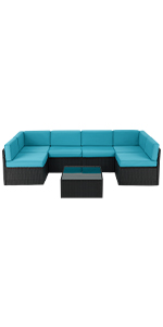 7 Piece Outdoor Patio Furniture Set, Outdoor Sectional Conversation Furniture Chair with Coffee Table, Patio Sectional for Backyard, Garden(Navy Cushions and Black Rattan)